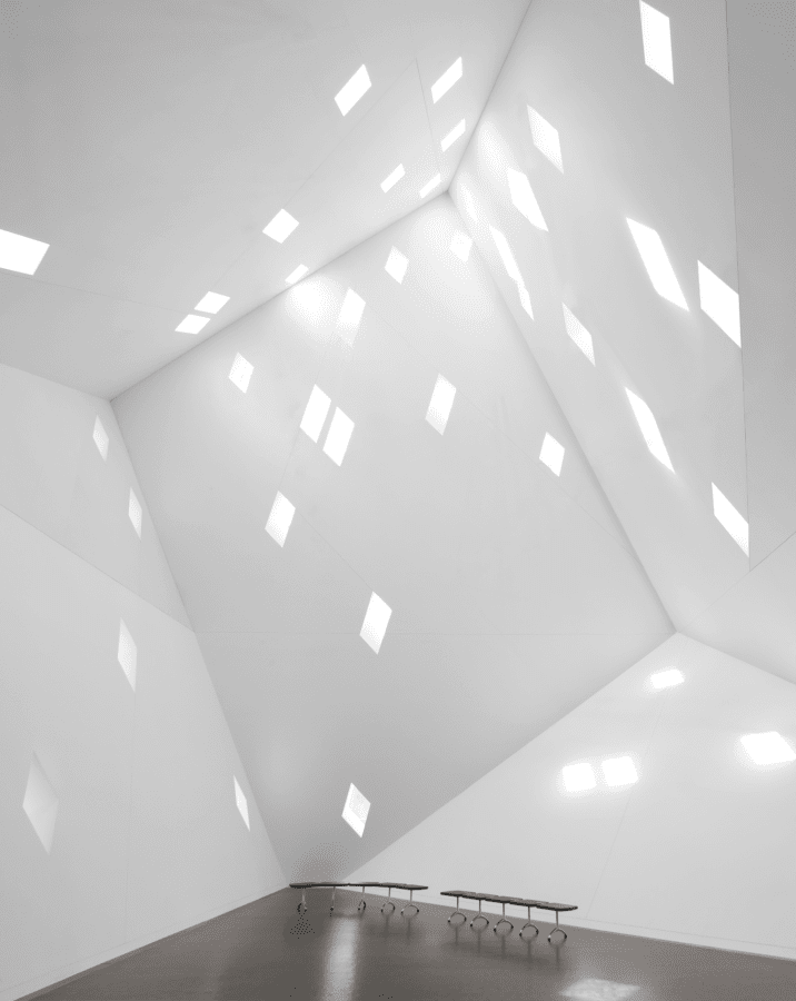 The second floor’s west end culminates in the dramatic 2,200-square-foot Stephen and Maribelle Leavitt Yud Gallery reaching at its peak some 65 feet high, symbolically representing the Hebrew letter yud. This floating gallery mimics the form of the yud, the only Hebrew letter that floats above the line. This mystical letter begins the Hebrew words for Jew, God, (or G-d) and Jerusalem, and is the second letter in the word chai for life. The ascending, dynamic movement up to the light-filled yud shape creates a compelling space for experiencing performances and artist installations.