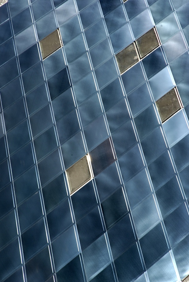 The blue color of the steel is achieved through a procedure called interference-coating. The steel was treated with a chemical bath to create a blue color and will not fade. This process involves shooting electricity through the steel and giving it a bath of a certain chemical mix, which causes the stainless steel to oxidize. Since there are no dyes or pigments to decay, the color will never fade or chalk. The CJM building was the first to feature this unique cross-hatching surface finish, which helps to diffuse and soften the reflection of light off the blue stainless steel.