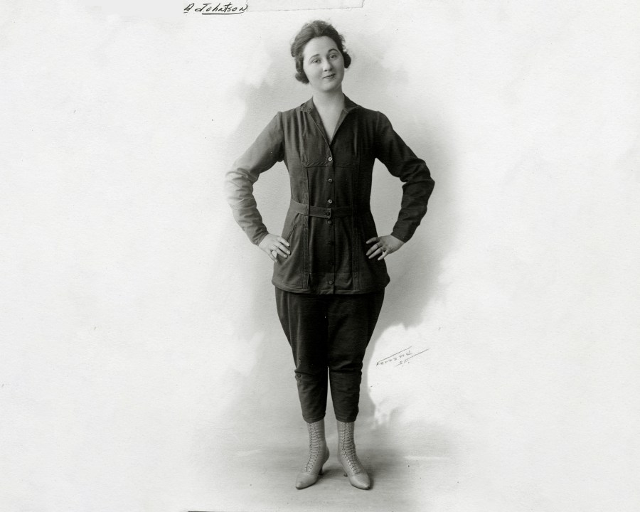 The next iteration of women’s pants surfaced during World War I, when many women took over jobs traditionally held by men. With this development came a need for more work-ready apparel, and Levi Strauss & Co. responded with a new one-piece garment called Freedom-Alls. These fulfilled the needs of both traditional dress and progressive ideals, offering the mobility of pants while remaining loose and stylistically reminiscent of skirts. Freedom-Alls also played off of the liberty language surrounding the war—while, intentionally or not, taking on a second meaning calling for women’s liberation and freedom of style.