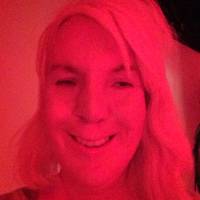 Image description: Head shot of a woman with wavy blonde hair and a big smile cast in a funky red glow.