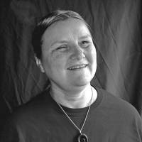 Image description: Photo of Sheri Wells-Jensen, a woman smiling with her head tilted slightly upwards towards the light.