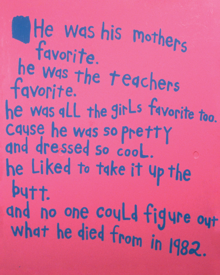 Cary Leibowitz, He Was His Mother’s Favorite, 1987. Latex paint on wood panel, 60.25 x 48 in. Courtesy of the artist and INVISIBLE EXPORTS.